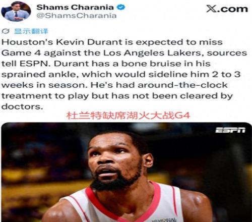 2026-04-28多宝体育,多宝体育官方网站,多宝体育APP下载北京时间4月27日,NBA季后赛西部首轮G4,火箭主场迎战湖人,这是一场不折不扣的生死战——输球即被淘汰。可就在赛前,NBA名记Shams带来重磅坏消息:杜兰特继续缺席,且伤情棘手,短时间内难以复出。