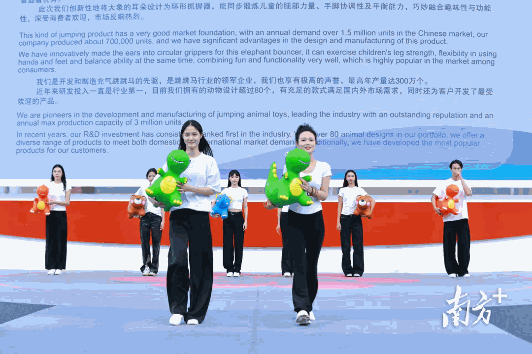 发布会现场,市潮玩协会和数家莞企在舞台旁设置互动展台,陈列琳琅满目的热销产品与新品,吸引全球采购商近距离洽谈与体验。