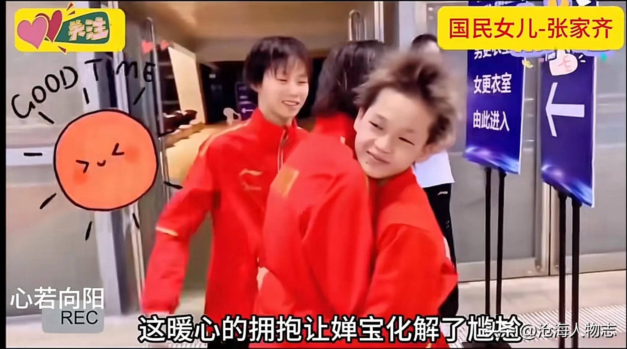 张家齐进入国家队后,跟奥运冠军陈若琳一起训练。陈若琳不仅毫不保留地传授经验,还亲切地叫她“巧闺女”,两人既是师傅又是朋友,在队内也成为了令人称道的佳话。有一次,张家齐在赛前训练时不小心打滑了,她笑着对陈若琳说:“是不是天公想给我加难度分?”陈若琳调皮地回应:“别贫嘴,小心真给你加个‘意外难度系数’。”这样轻松一笑,紧张的气氛立刻消散。